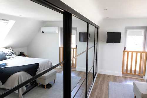For their main bedroom, Mark and Clare chose our Classic mirror sliding doors with a sleek black frame — a timeless combination that adds a modern touch while reflecting light to make the space feel larger. “The mirrored doors completely transform the room,” says Clare. “It feels brighter, more open, and really elegant.”
