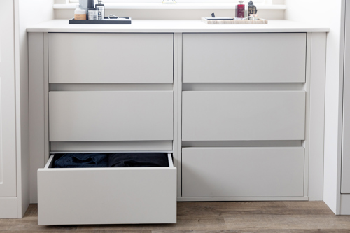 Working closely with Spaceslide designer Nimesh, William chose our Latitude Hinged Wardrobe collection with integrated shelving and draws, the perfect balance of form and function. The beautiful shaker wardrobes created a seamless aesthetic, while the additional shelves provided a significant boost in storage space available.